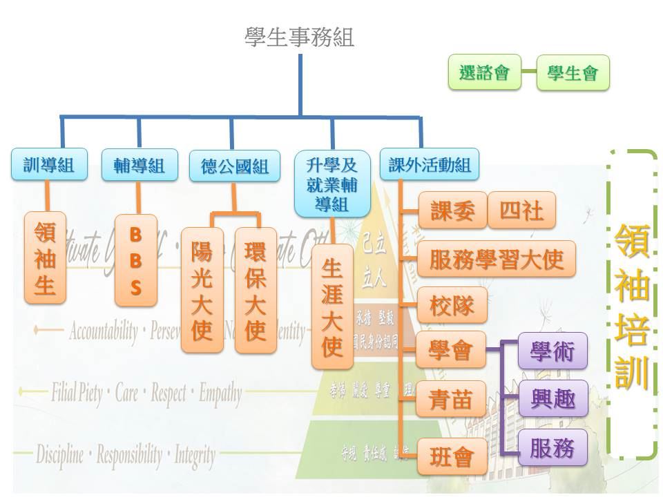 Encourage and train students to take on leadership roles. Students are given opportunities, from S1, to participate in various societies and extra-curricular activities. They are also given opportunities to plan and organize activities in the capacity of society/club committee members, regardless of the secondary school year they are in. Student cultivation–oriented education emphasizes students' roles as coaches in the learning process. As such, students' preferences, interests and abilities should be accommodated, and the content of learning should be explored and developed by students rather than entirely handed down by teachers. Training and development since a young age enable students' excellence in extra-curricular activities, particularly in leadership. Therefore, students are routinely involved in planning of the school's major activities, such as athletic meets and themed open days. This serves to enhance students' leadership, and to promote and implement the school's motto of "after establishing yourself, help establish others".